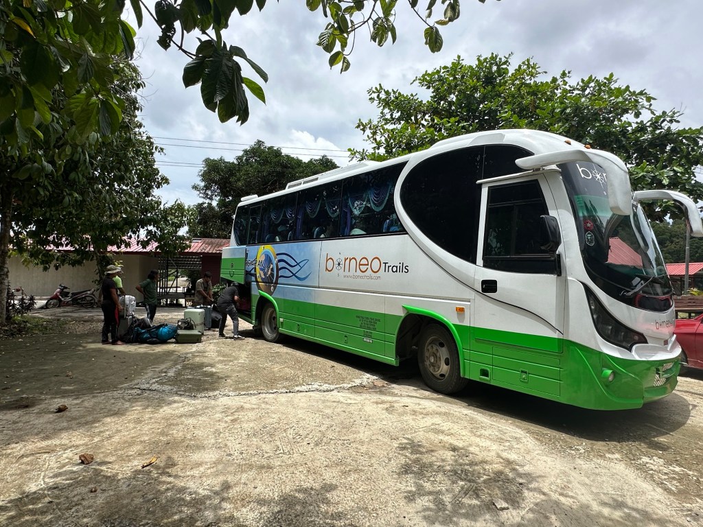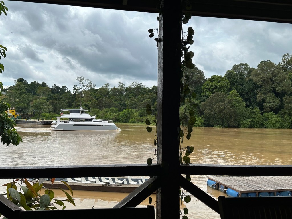 Our itinerary included driving back to Sandakan right after breakfast but the air conditioner gods had other plans and our driver reported that the air conditioner on the bus wasn’t working and he was taking it down the road in an attempt to get it fixed. Our departure time was pushed back to 10:30, then 11:30, then no updates except that something else had also required fixing. Everyone sat around our large table, already checked out of our cabins, trying to entertain ourselves as we waited. There were pictures, games, snacks, ice cream, boredom, stretching. I was distracted when nice boats started passing on the river including beautiful yachts and sailboats. The weekend really is a whole different level of maritime traffic. Finally, just after noon, we were loaded onto the repaired bus.