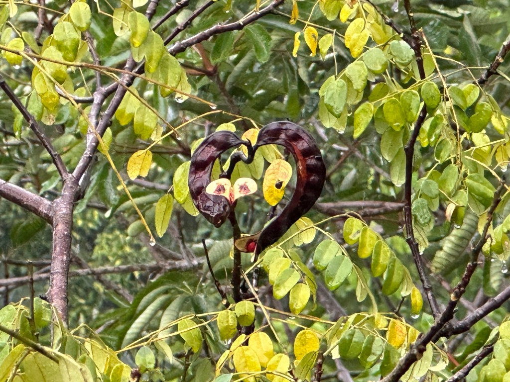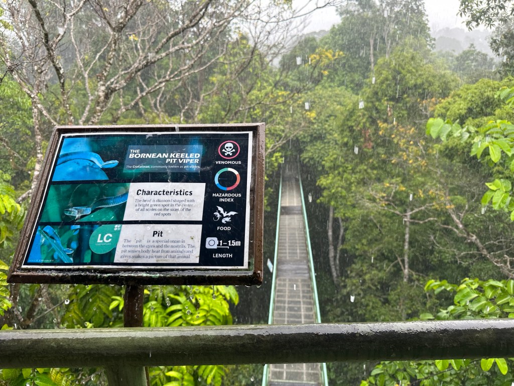 Without much of a crescendo, the trickle turned into a massive downpour as the group neared the first tower. I reluctantly pulled on my rain poncho and immediately felt humid and disturbed as the plastic stuck to my wet skin. I regretted putting it on once I realized that our next move was climbing up the stairs to the first observation tower; which provided shelter. There wasn’t much to see from this tower except for an informational sign on the Bornean Keeled Pit Viper. Ahh, so they do have snakes that can kill me here. Good to know. We hung out at the top of the observation tower for at least a solid half hour, waiting to see if the rain would slow but it did not. Kurt asked if we wanted to keep going in the rain and the answer was a resounding yes. Only one or two people did not want to and he said they could go back and wait at the bus so we could continue on.