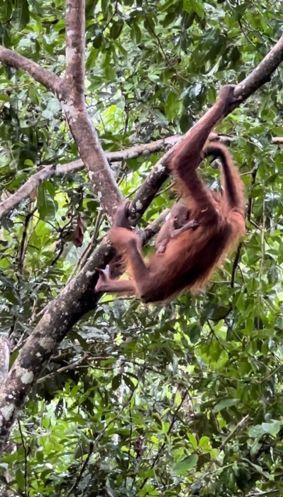 Boy did those people miss out. Just a few steps off the tower another orangutan was spotted in the trees. Not far from the walkway she swung from branch to branch, and she had a baby clinging to her! I was at the front of the pack with Kurt and moved ahead to keep up with the direction she was going. You know it’s something special when even the guide is in awe of the sights and almost brought to tears himself. The baby was brand spanking new; likely only about one week old. Kurt described seeing a wild infant that young as “epic.”
