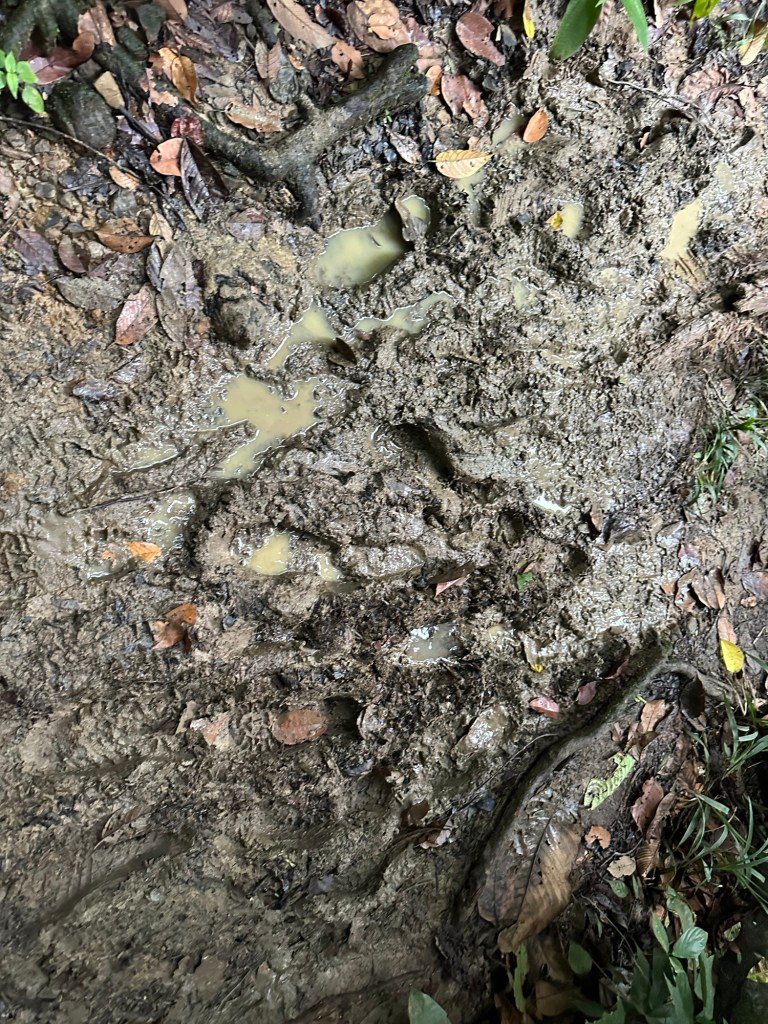 At 3:30 we met back in the cafe to leave on our first activity of the day; the jungle hike on the Elephant Trail to the mud volcano which is supposed to be a popular spot for a variety of animals. The itinerary described this as a 3-4 hour hike but alas, it’s only 1 km (.6 miles) each way. Kurt and our Tabin guide, Lee, suggested that we try to wear their rubber boots but they had none in my size. One size down and my toes were pressed against the edge; one size up and every time I took a step my foot slid all the way out. I asked him just how muddy the trail was and he sized up my shoes and said I’d be fine to wear my own; they would wash and dry them for me after. About 2/3 of the ladies in the group seemed to go this route as well.